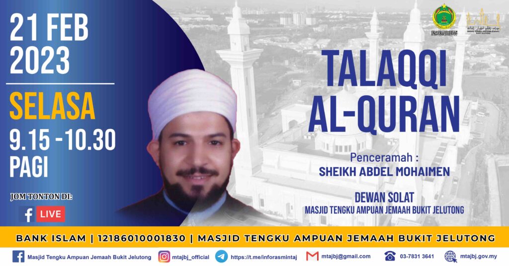 KULIAH MAGHRIB : 22 FEB 2023 (RABU)MAKLUMANProgram MTAJ seperti berikut :-. Kuliah Maghrib MTAJ FB LIVE Selepas Solat Maghrib Ustaz Syafiq Abdullah Tajuk : Penawar Bagi Hati.𝐉𝐚𝐧𝐠𝐚𝐧 𝐥𝐮𝐩𝐚 𝐮𝐧𝐭𝐮𝐤 𝐋𝐢𝐤𝐞 & 𝐒𝐡𝐚𝐫𝐞!.#sama2berdoa#semogadosakitadiampunkan#demikebaikanbersama#mtaj #jais IKUTI KAMI DI MEDIA SOSIAL Facebook Instagram Telegram Youtube