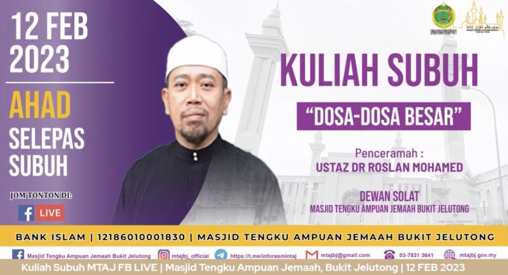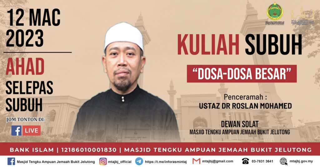 KULIAH SUBUH : 12 MAC 203 (AHAD)MAKLUMANProgram MTAJ seperti berikut :-. Kuliah Subuh MTAJ FB LIVE Selepas Solat Subuh Ustaz Dr Roslan Mohamed Tajuk : Dosa-Dosa Besar𝐉𝐚𝐧𝐠𝐚𝐧 𝐥𝐮𝐩𝐚 𝐮𝐧𝐭𝐮𝐤 𝐋𝐢𝐤𝐞 & 𝐒𝐡𝐚𝐫𝐞!.#sama2berdoa#semogadosakitadiampunkan#demikebaikanbersama#mtaj #jais IKUTI KAMI DI MEDIA SOSIAL Facebook Instagram Telegram Youtube